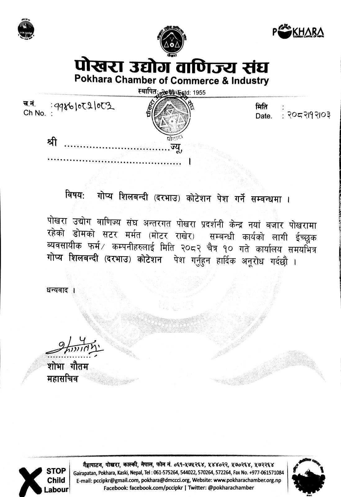 गोप्य शिलबन्दी (दरभाउ) को६ेशन पेश गर्ने सम्वन्धमा News Coverage March 17, 2026 PCCI PKR SearchSearchRecent Postsगोप्य शिलबन्दी (दरभाउ) को६ेशन पेश गर्ने सम्वन्धमा पोखरामा उद्यम क्लिनिक सुरु भारत र नेपालबीचको साझेदारी फलदायी रहेको भारतीय दूताबासका प्रथम सचिव सुमनको भनाइ पोखरा एयरपोर्टबाट भारतका सहरमा उडान सुनिश्चित गर्न पोउवा संघको माग पोउवा संघको सहयोगमा पोखरा रंगशालाभित्र खानेपानी फिल्टर मेसिन खेलाडी र दर्शकलाई मिनिरल वाटरजस्तै तातो र चिसोपानी थोक व्यवसायी संघ कास्की पोखरा र सर्बेश्वोर ब्यबसायी समितिमा आबद्ध ब्यबसायिहरुलाई आयकर तथा भ्याट सम्बन्धी २ दिने तालिम सम्पन्न Donate Us